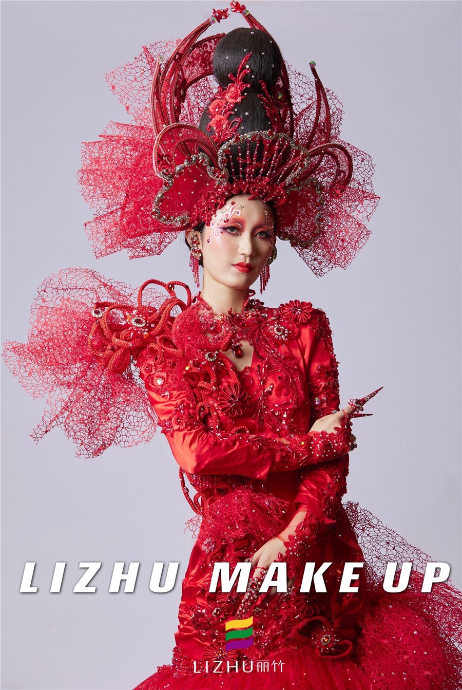 南寧彩妝造型培訓(xùn)學(xué)校創(chuàng)意彩妝作品---戰(zhàn)姬:這款整體造型以“中國(guó)紅”為主色,修身的魚(yú)尾裙擺設(shè)計(jì)配以水鉆、刺繡和精致的頭飾,妝面以紅色為主,運(yùn)用簡(jiǎn)單線條描繪以及大面積暈染的手法處理,妝面與服裝、頭飾相呼應(yīng),視覺(jué)沖擊十足。