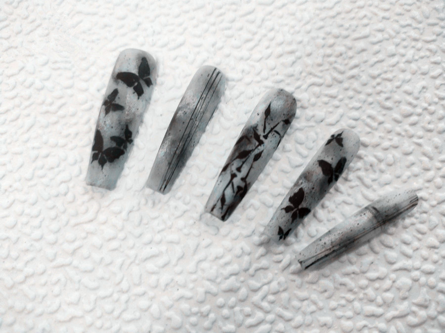 使用乳白色彩繪膠打底,蘸取黑色甲油膠在甲面上隨意鋪展開,然后在慢慢進行自然過渡的暈染,打造色彩在水面暈開的感覺。之后在用彩繪筆畫出黑色蝴蝶圖案及其他點綴圖案,蕞后涂上磨砂封層,使得整副作品的圖案更加逼真,蝴蝶仿馬上就要翩翩起舞,看起來很有靈氣。同時也將經典的文雅氣韻躍于“指”上。