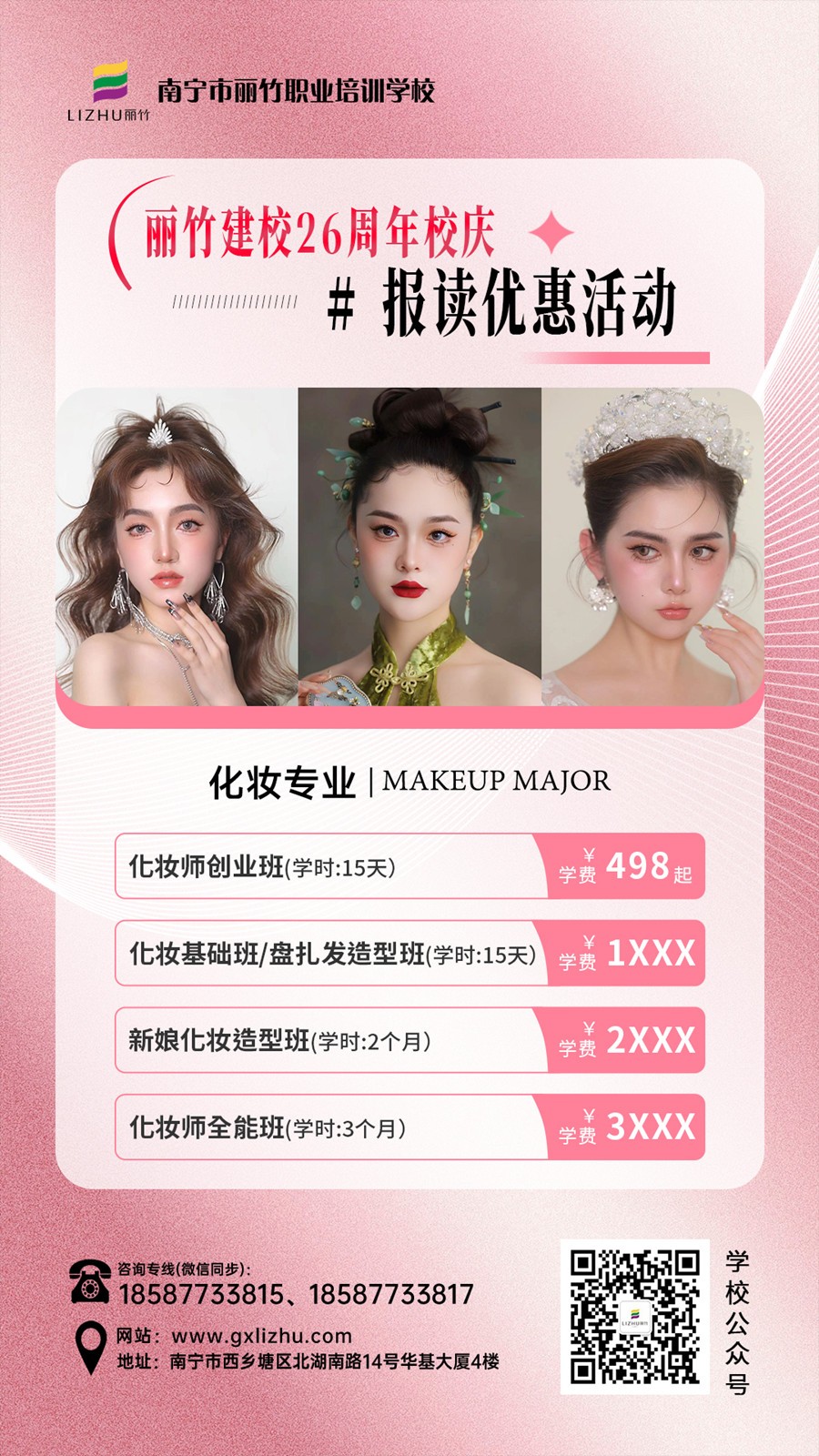 如果你想知道廣西學(xué)彩妝哪里學(xué)費(fèi)便宜?那及千萬(wàn)不要錯(cuò)過(guò)廣西彩妝學(xué)校排行前十的麗竹學(xué)校正在進(jìn)行的建校26周年報(bào)讀優(yōu)惠活動(dòng)啦!因?yàn)?,只要現(xiàn)在報(bào)名,學(xué)習(xí)化妝全部都是親民價(jià)!
